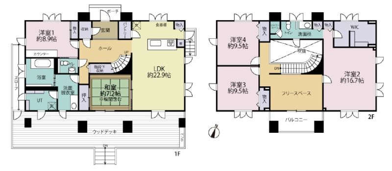 | その他設備 | 町営水道、合併浄化槽、ウォークインクローゼット、浴室に窓(1階)、シャワールーム(2階)、洗面所2カ所、和室、洋室、吹抜け、ウッドデッキ、庭 |
