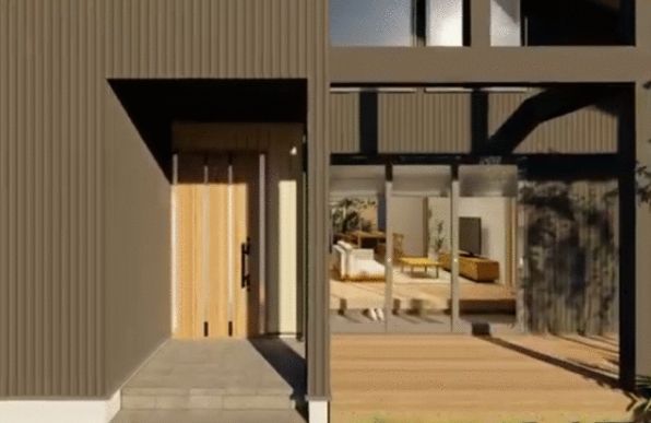 勾配天井と軒天は高さを揃えて家の中と外が一体となることで空間のつながりを演出してくれます。