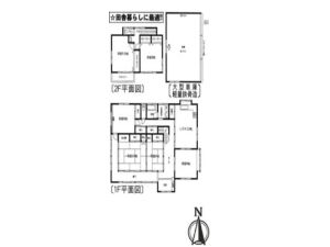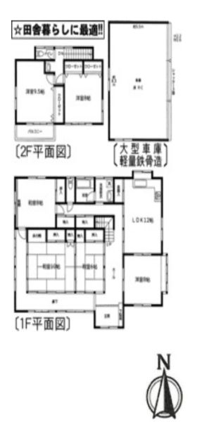 建物は6LDK+大型車庫の間取りで、車庫には大型車を含む3台分の駐車が可能。