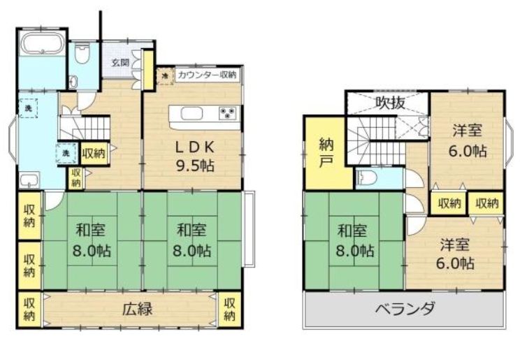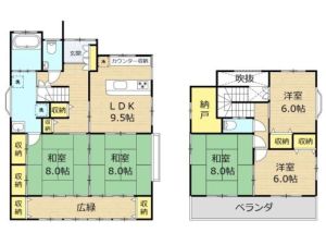 | その他設備 | 整形地 土地50坪以上 南側道路面す 前道6m以上 2階建 和室 システムキッチン 独立洗面台 追い焚き 浴室に窓 浴室乾燥機 バルコニー有 小学校徒歩10分以内 2台駐車可 シューズボックス |