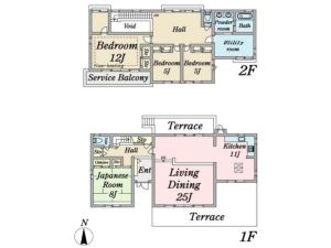 | その他設備 | 温水洗浄便座/トイレ2ヶ所/システムキッチン/クローゼット/納戸/吹抜/LDK20 畳以上 エアコン/床暖 房/BS端子/バルコニー/南面バルコニー/駐車場3台分/南向き/前道6m以上 |