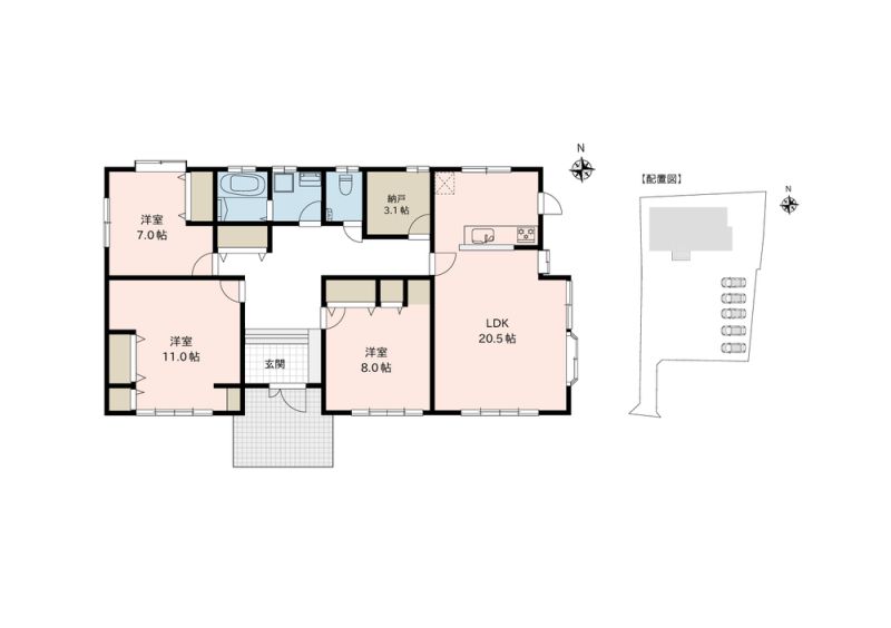 全居室7帖以上でゆとりのある間取り。敷地内には駐車5台可能です。