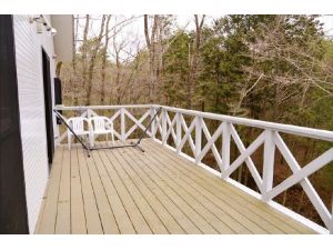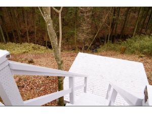 広いウッドデッキで、小川の水音を聞きながらリラックス。