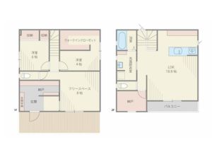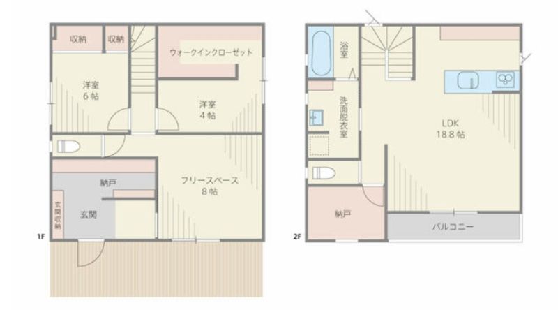 間取りは、1階に寝室、2階に浴室とリビングキッチンを配置した設計。