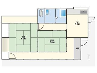 - 和室中心の平屋住宅です。南向きに面した広縁があり、日当たりの確保に配慮された設計となっています。8畳と6畳の続き間は、用途に合わせて一体利用も可能です。周辺は戸建て住宅が立ち並ぶ落ち着いた環境です。