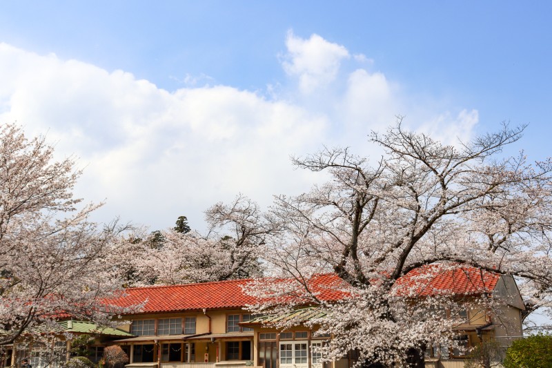 桜に彩られた木造校舎は、心が惹きつけられる光景です。