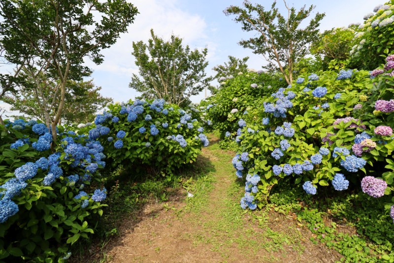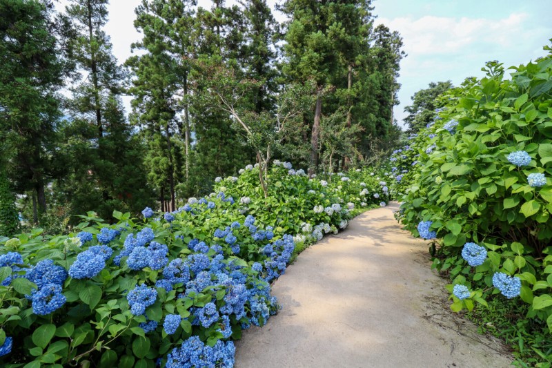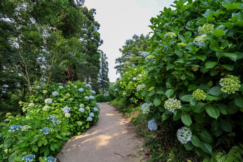 散策路を進んで行くと、両脇にブルーのあじさいが!