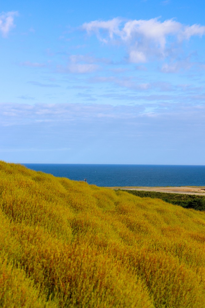 みはらしの丘の上の方まで歩いてくると、コキア越しに海が見えてきます。