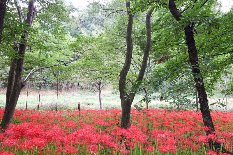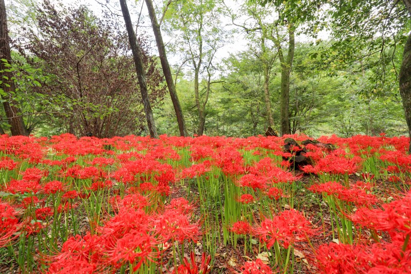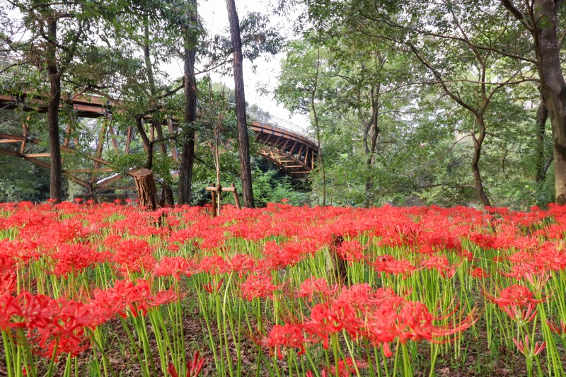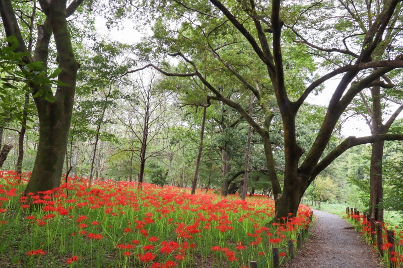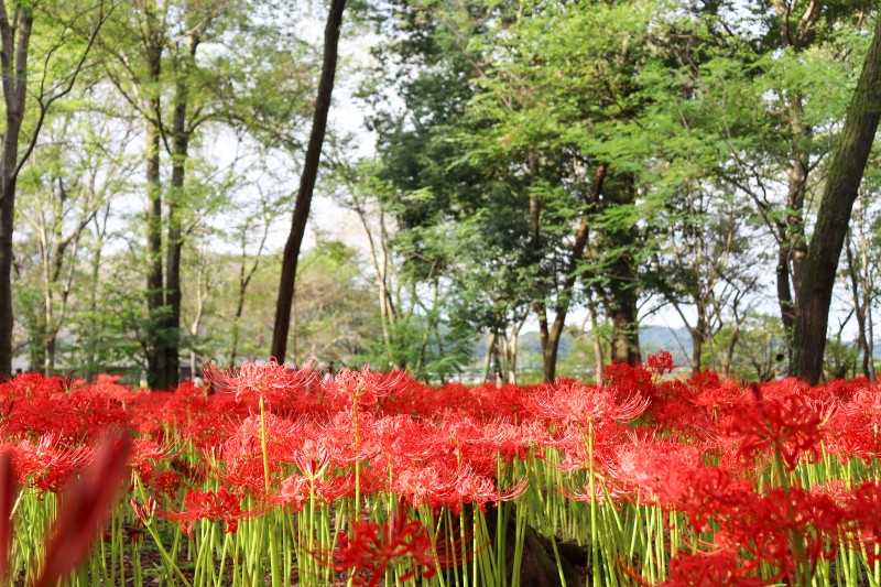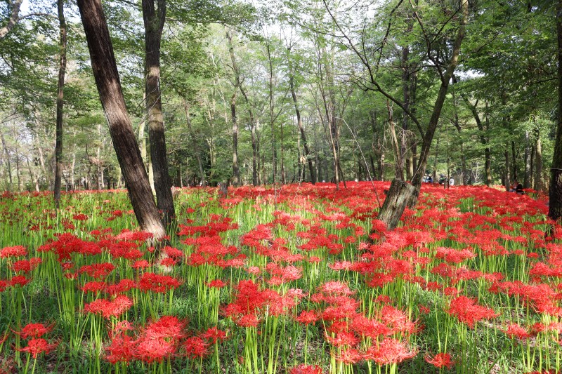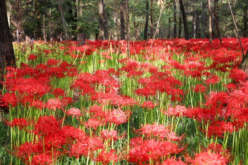 巾着田の曼珠沙華公園は周囲を木々に囲まれているため、