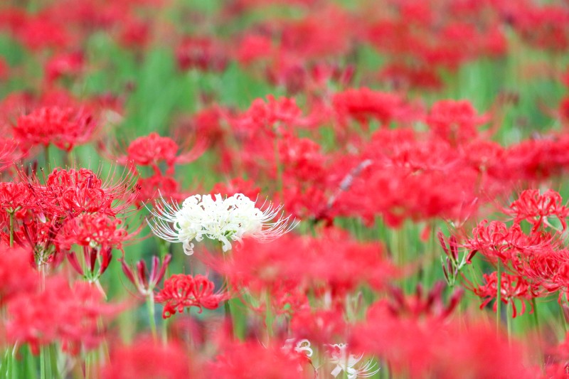 赤い曼珠沙華の中に一輪だけ、ポツンと咲く白い曼珠沙華を発見しました。