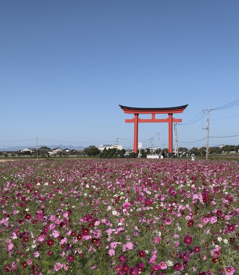 全国各地にコスモス畑がありますが、鳥居と一緒に写真を撮ることができる場所は、日本全国を探してもなかなかないかもしれません。