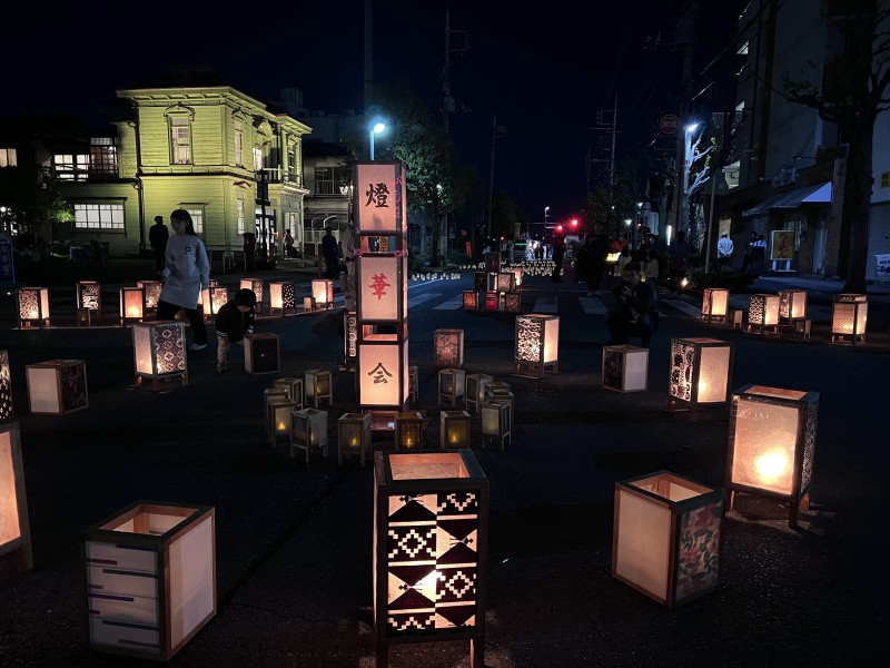 灯籠の中には、地元伊勢崎市の「伊勢崎銘仙」模様の「銘仙灯籠」も飾られていました。