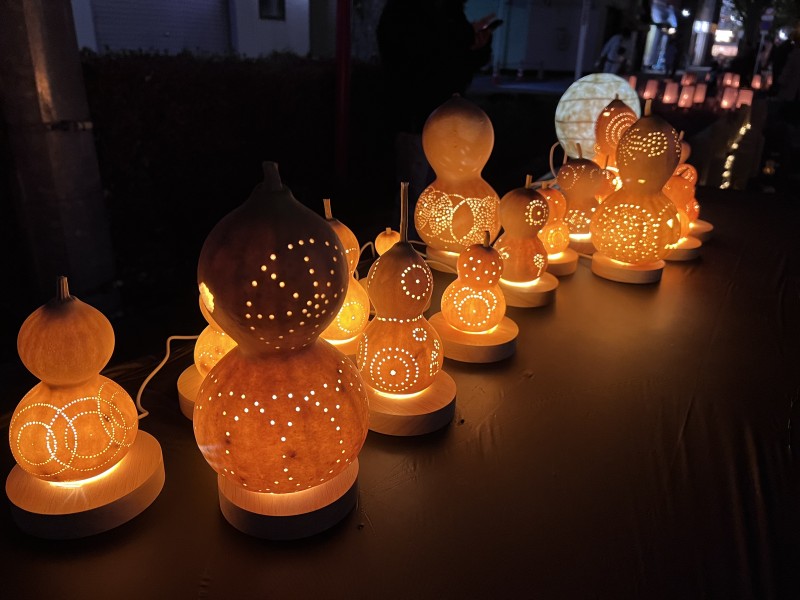カップの灯籠や竹筒に繊細な細工を施した竹筒灯籠など様々な灯りが灯り、約150メートルの通りは幻想的に輝いていました。