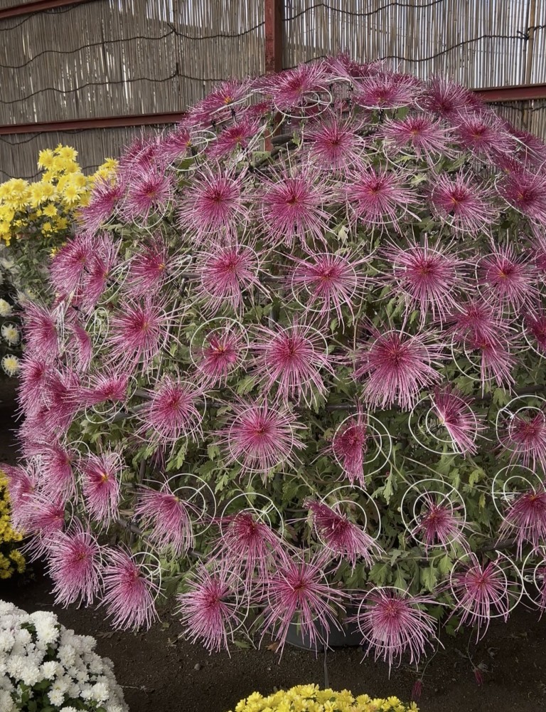一本の苗を何回も摘心を々て枝数を増やし、半球型になるように花を並べて咲かせ仕立てた菊「大作り(千輪咲)」です。