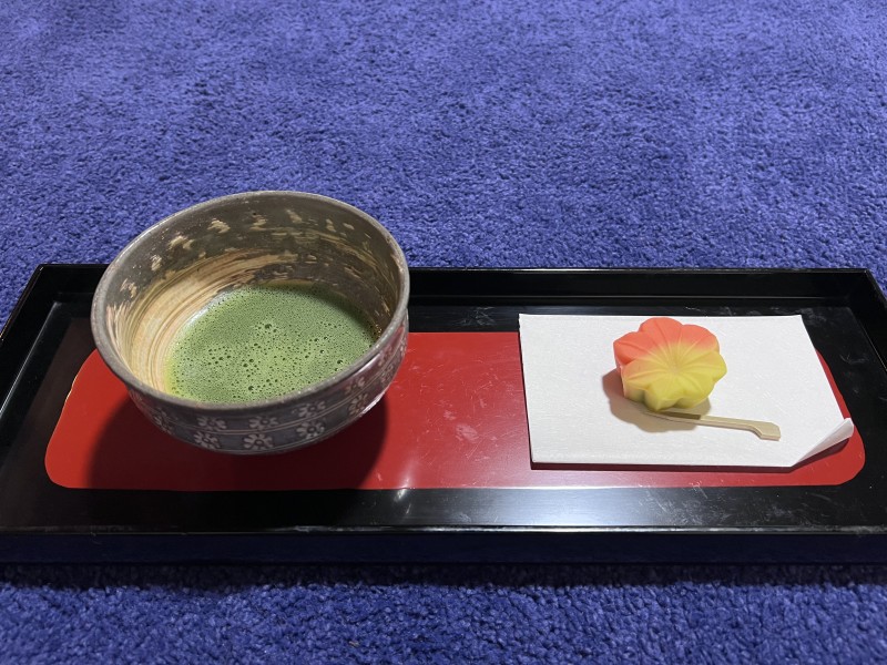入場する際、受付で「志納金」を納めると、ライトアップやプロジェクションマッピングを見るほか、こちらのお茶室で和菓子とお抹茶をいただけます。