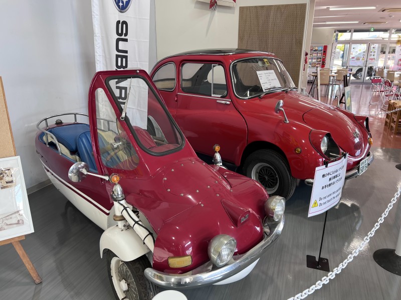 奥にあるのは、通称「てんとう虫」と呼ばれる「スバル360」。