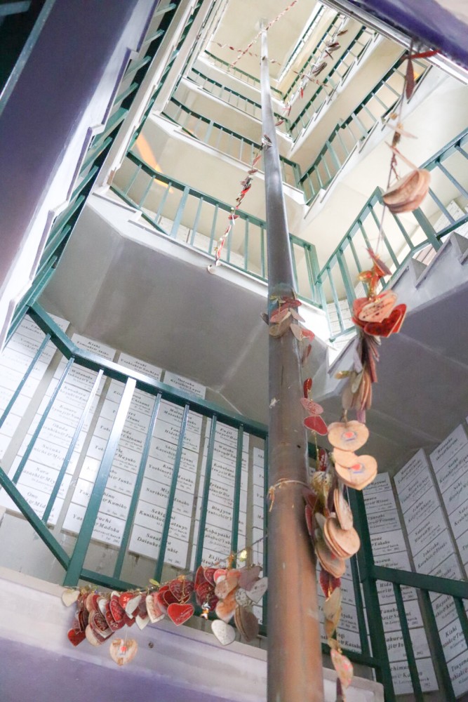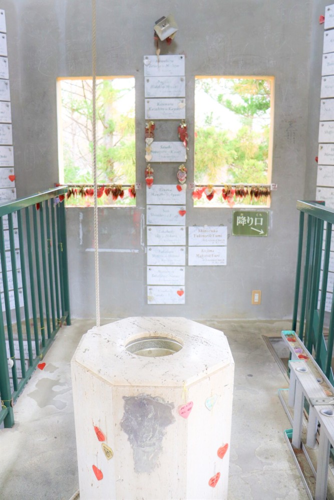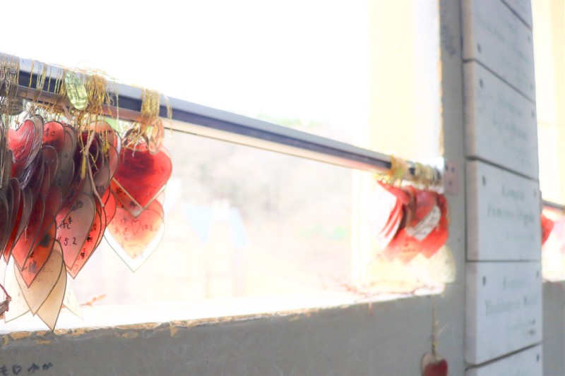 小窓や柱に願い事が書かれたハート形の絵馬がたくさん!