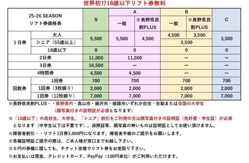ファミリー層に優しい料金体系も、Mt.乗鞍スノーリゾートの大きな魅力です。