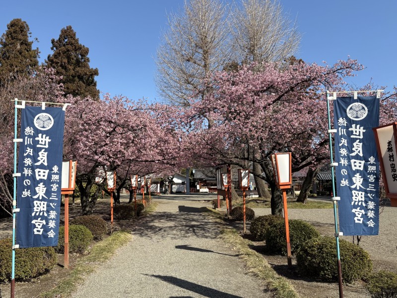 世良田東照宮の南御門から延びる参道の両脇に咲く河津桜。